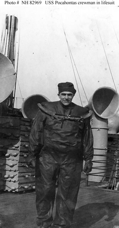 Photo #: NH 82969 USS Pocahontas (ID # 3044) Crewmember wearing an unsinkable life suit, circa 1917-1919. Note the paravane on deck, at left. Collection of the USS Pocahontas Reunion Association, 1974. U.S. Naval Historical Center Photograph. Online Image: 51KB; 400 x 765 pixels |