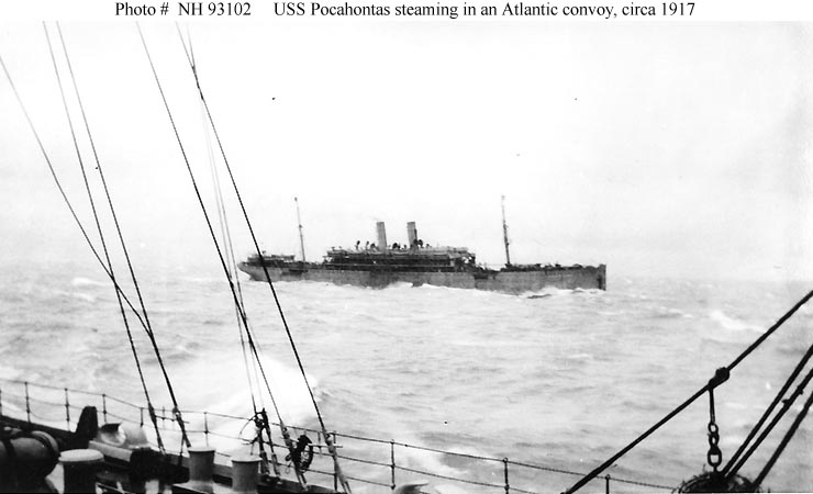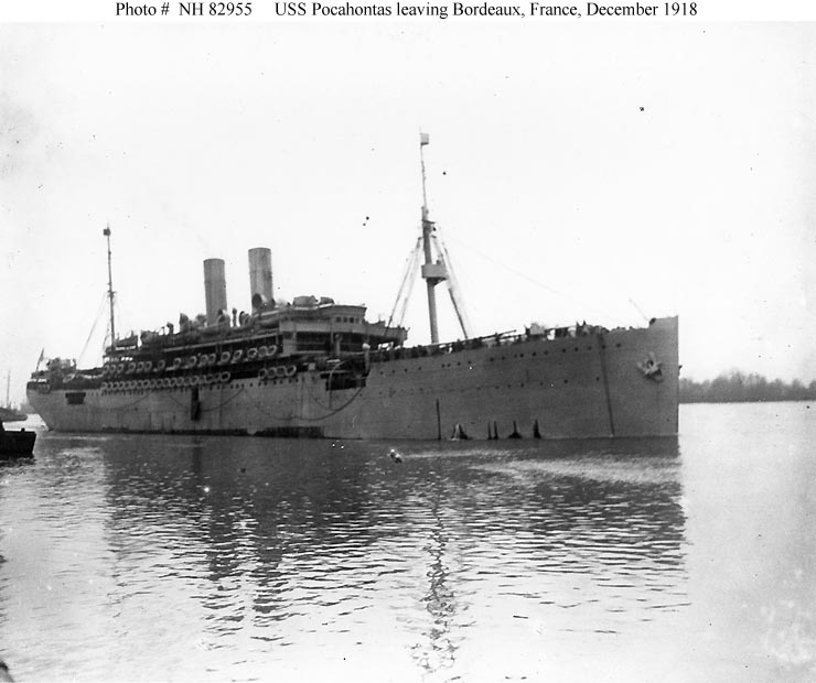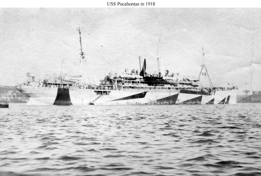 With other interned German ships, she was seized when the United States entered the conflict in April 1917 and turned over the the Navy. In late July, while refitting at the New York Navy Yard, the ship was placed in commission as USS Prinzess Irene (sometimes spelled Princess Irene). Renamed Pocahontas at the beginning of September, and later assigned Navy registry ID # 3044, she made her initial voyage as a Navy troop transport during September and October 1917, steaming from New York to St. Nazaire, France, and back. Eight more round-trips trips between the U.S. and France followed before the fighting ended in November 1918. In all, Pocahontas carried more than 24,000 service personnel to the combat zone. During her wartime service, she had one notable encounter with the enemy, a running gun battle with a German submarine on 2 May 1918 that produced no damage to either side.