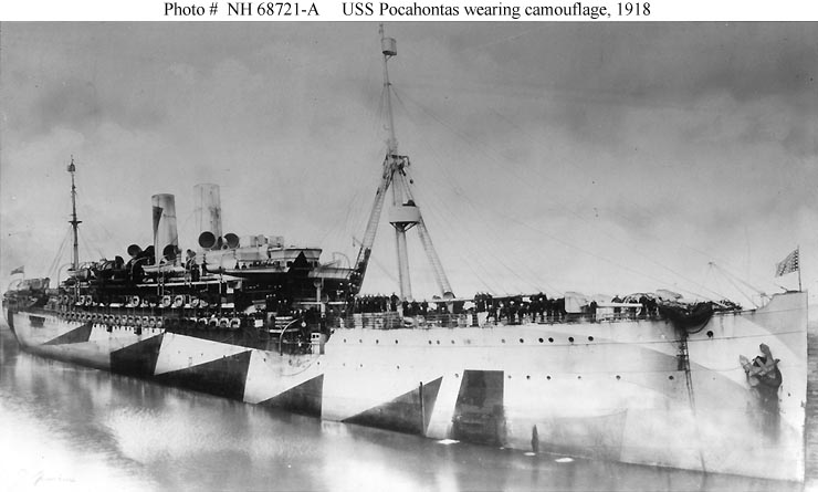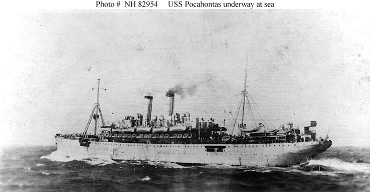 USS Pocahontas, a 18,000 ton (displacement) transport, was built at Stettin, Germany, in 1900 as the 10,881 gross ton passenger liner Prinzess Irene. As part of the North German Lloyd shipping line, she made commercial voyages from Germany and the Mediterranean to America and the Far East. Prinzess Irene had recently arrived at New York when World War I began in early August 1914, and British dominance of the sea routes kept her there, laid up, for the next three years.