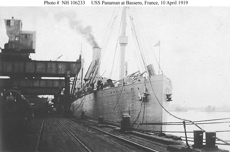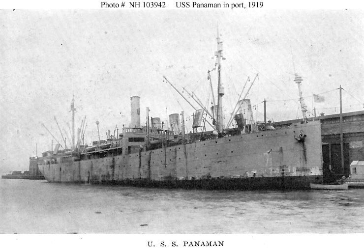 Panaman, a 6655 gross ton freighter, was built in 1913 at Sparrows Point, Maryland, for the American Hawaiian Steamship Company. She was taken over by the Navy for World War I service in August 1918 and placed in commission in mid-month as USS Panaman (ID # 3299). Assigned to the Naval Overseas Transportation Service, she took cargo to France in a round-trip voyage during September and October. Upon returning to the U.S. she was refitted to carry large numbers of horses, and made a second trip to and from France in October and November. Panaman then began conversion to a troop transport. Reassigned in December to the Cruiser and Transport Force, the ship brought nearly eleven-thousand war veterans home from Europe during the first eight months of 1919. USS Panaman was decommissioned in September 1919 and returned to her owner. As S.S. Panaman she had a subsequent commercial career that lasted through World War II. In July 1947 the old ship was sold to the Italian Government.