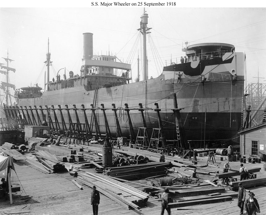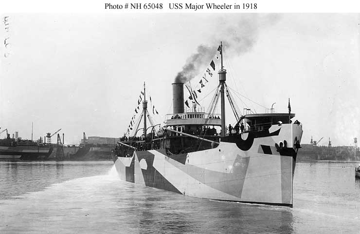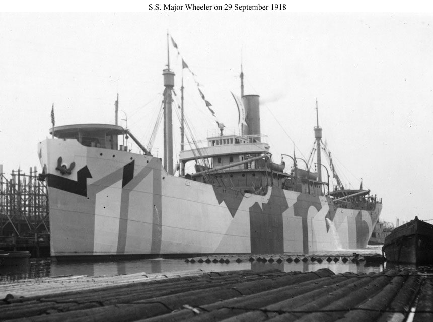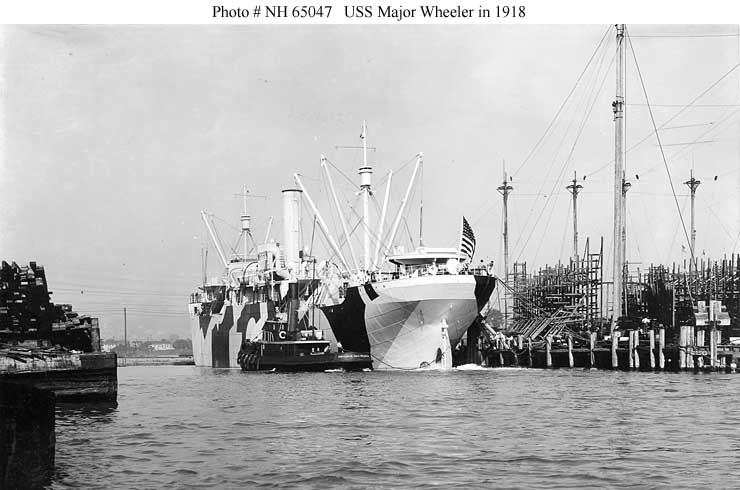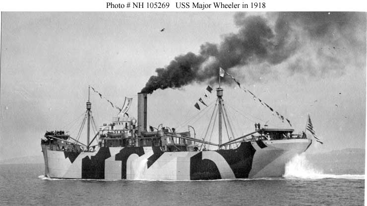 Major Wheeler, a 3431 gross ton (7020 tons displacement) freighter, was built at Oakland, California. Completed in September 1918, she was commissioned in the Navy on 8 October 1918 as USS Major Wheeler (ID # 3637). The ship departed San Pedro, California, in November 1918 for Callao, Peru, with general cargo, which upon arrival she exchanged for a load of nitrates. Major Wheeler discharged the nitrates at Charleston, South Carolina, in December and in January 1919 moved to New York to load general cargo for ports in South America. After undergoing repairs, the ship sailed from New York in February 1919, delivered her cargo at various locations during March and April, and returned to New York in May with a shipment of maize from Argentina. USS Major Wheeler was decommissioned on 19 May 1919 and returned to the U.S. Shipping Board. Sold in 1922, she continued to operate as S.S. Major Wheeler until 6 February 1942, when she was torpedoed and sunk off the U.S. east coast by the German submarine U-107, with the loss of her entire thirty-five man crew.