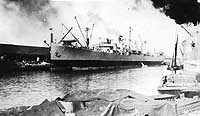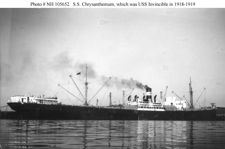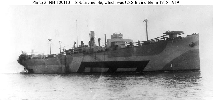 S.S. Invincible, a 7898 gross ton (15,942 tons displacement) freighter, was built at Alameda, California, in 1918. Originally begun as the British steamer War Rock, she was taken over by the U.S. Emergency Fleet Corporation freighter prior to completion and renamed. The new ship was transferred to the Navy in October 1918 and placed in commission at that time as USS Invincible (ID # 3671). Her initial voyage, from late October to late November, took her through the Panama Canal to the U.S. East Coast. In December Invincible carried supplies to England, returning to the U.S. at the beginning of February 1919. A second trans-Atlantic round trip was followed by decommissioning, in mid-April of that year, and transfer to the U.S. Shipping Board.