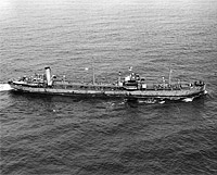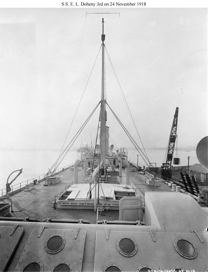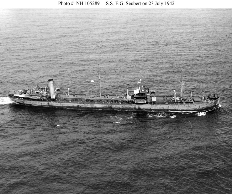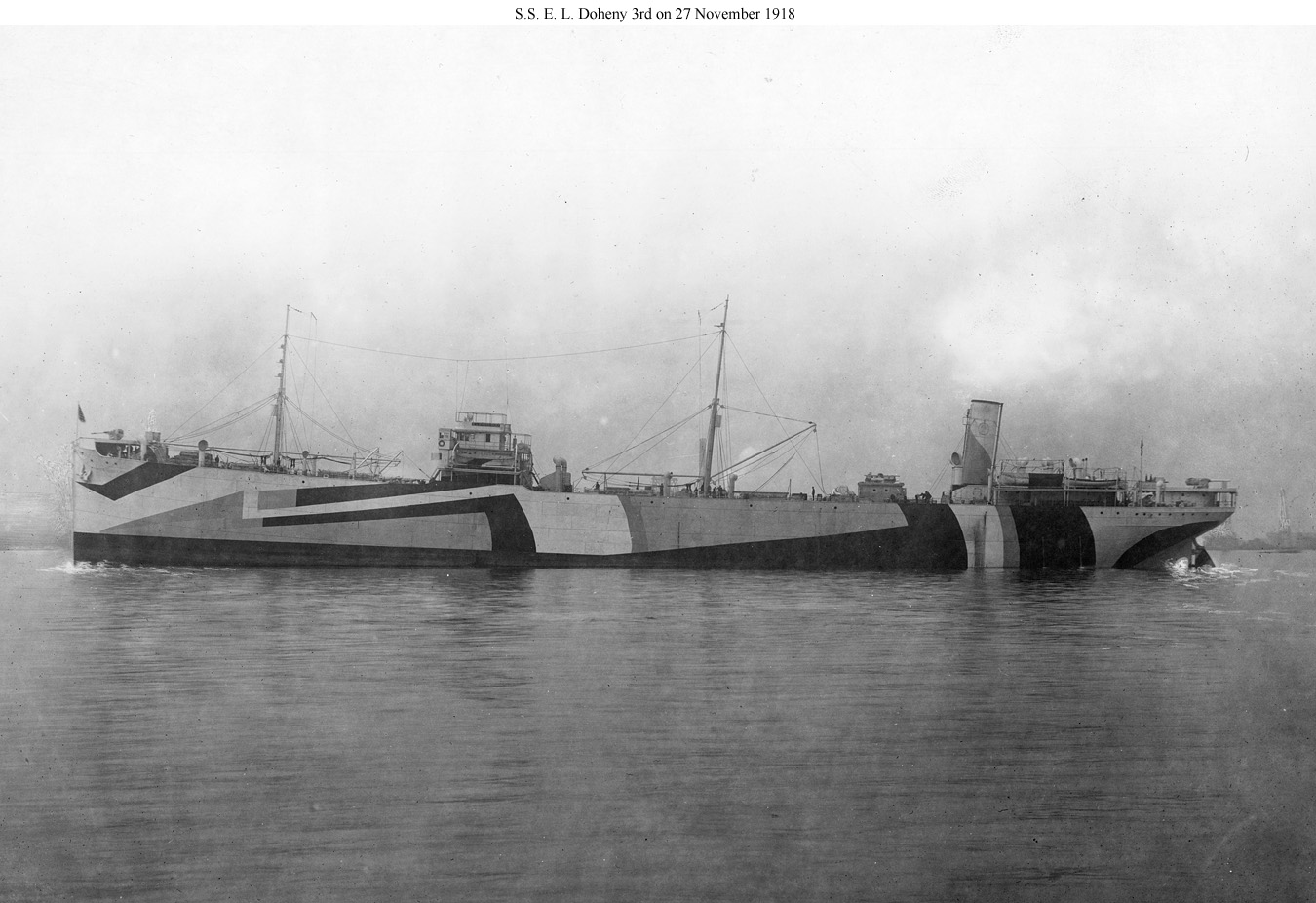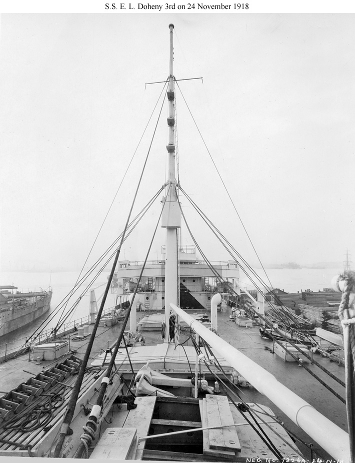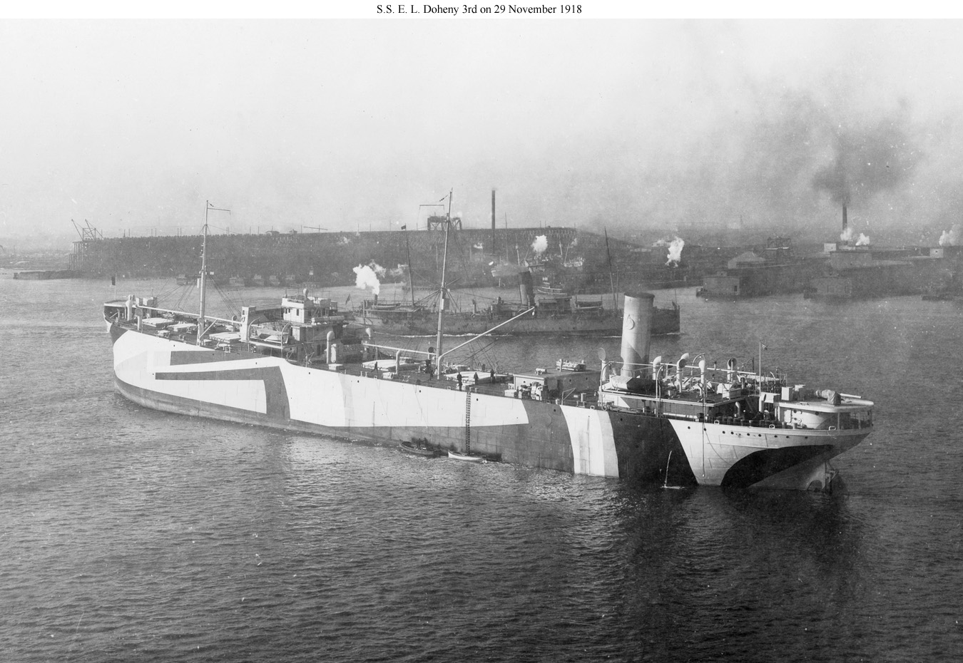 S.S. E. L. Doheny, Third (sometimes rendered incorrectly as E. L. Doheny III), a 8118 gross ton (18,220 tons displacement) tanker named for a grandson of the oil tycoon Edward L. Doheny, was completed at Camden, New Jersey, in November 1918 where she was the yard's contract no. 190. She was commissioned in the Navy in November 1918 as USS Edward L. Doheny III (ID # 3835). Her first Navy voyage took her to Tampico, Mexico, to load oil which she delivered to Newport, Rhode Island, in December 1918. The tanker then reloaded at Port Arthur, Texas, and delivered fuel to the Azores in January 1919. From there she was directed to Italian ports to replenish Italian fuel stocks used by six U.S. destroyers operating in the Mediterranean. Back at New York in March, Edward L. Doheny III repeated her voyage to Gibraltar and Italian ports in April and May. Between May and July she carried fuel to Gibraltar, Brest, and Devonport. In July the ship delivered a load of fuel to Melville, Rhode Island; in August she delivered oil to the Panama Canal Zone and Guantanamo Bay; and in September she carried fuel oil from New Orleans to the Clyde. USS Edward L. Doheny III was decommissioned in November 1919 and transferred to the U.S. Shipping Board for return to her owners. During subsequent commercial service the tanker was renamed F. H. Wickett in 1920 and E. G. Seubert in 1930. S.S. E. G. Seubert was torpedoed and sunk by the German submarine U-510 in the Gulf of Aden on 23 February 1944. Six men were lost with her, including three members of the ship's U.S. Navy Armed Guard.