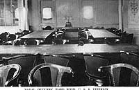 Photo #: NH 103322 USS Zeppelin (ID # 4042) Halftone reproduction of a photograph taken in 1919, showing the Naval Officers' ward room on board the ship. This image is one of ten photographs published in a "Souvenir Folder" of views concerning USS Zeppelin. Donation of Dr. Mark Kulikowski, 2005. U.S. Naval Historical Center Photograph. Online Image: 85KB; 740 x 505 pixels |