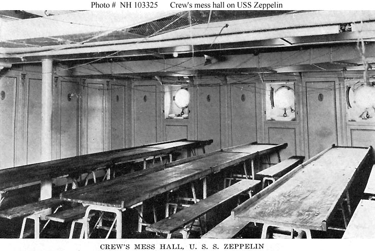 Photo #: NH 103325 USS Zeppelin (ID # 4042) Halftone reproduction of a photograph taken in 1919, showing the crew's mess hall. This image is one of ten photographs published in a "Souvenir Folder" of views concerning USS Zeppelin. Donation of Dr. Mark Kulikowski, 2005. U.S. Naval Historical Center Photograph. Online Image: 93KB; 740 x 495 pixels |