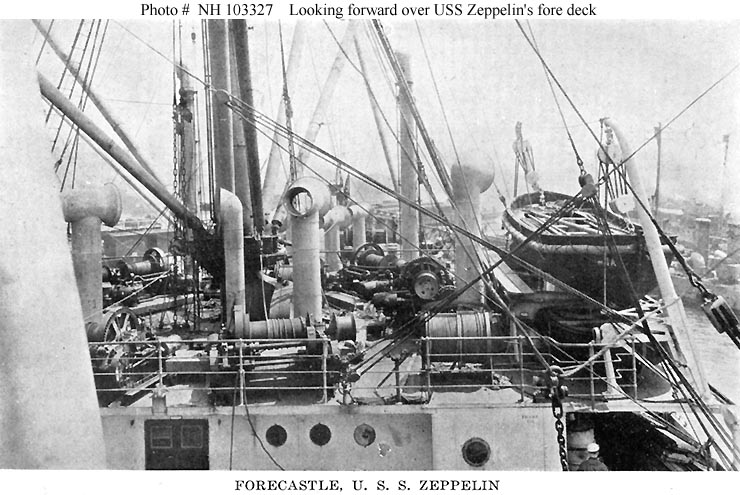Photo #: NH 103327 USS Zeppelin (ID # 4042) Halftone reproduction of a photograph taken in 1919, looking forward over the ship's foredeck. Note lifeboat, davits and ventilators. This image is one of ten photographs published in a "Souvenir Folder" of views concerning USS Zeppelin. Donation of Dr. Mark Kulikowski, 2005. U.S. Naval Historical Center Photograph. Online Image: 100KB; 740 x 495 pixels |