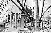 Photo #: NH 103324 USS Zeppelin (ID # 4042) Halftone reproduction of a photograph taken in 1919, showing the ship's promenade deck. Note the life rafts hung outboard of the railings, and the lines attached to the rafts. This image is one of ten photographs published in a "Souvenir Folder" of views concerning USS Zeppelin. Donation of Dr. Mark Kulikowski, 2005. U.S. Naval Historical Center Photograph. Online Image: 96KB; 740 x 490 pixels |