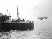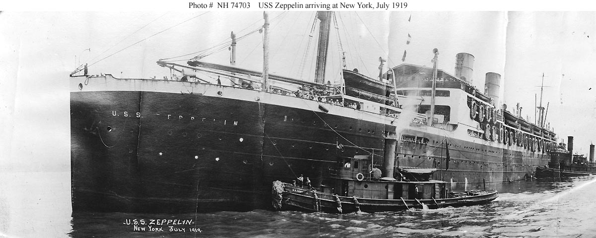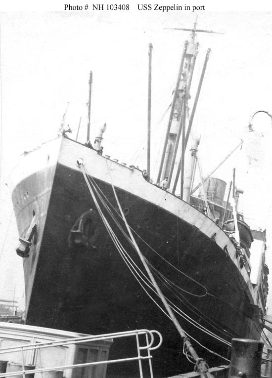 USS Zeppelin, an 21,753 ton transport, was built in 1914 at Vegesack, Germany, as the 15,200 gross ton German flag commercial passenger liner of the same name. She was acquired by the Navy in 1919, and was placed in commission in early March of that year. During the following months she brought nearly 16,000 passengers home from Europe, mainly American World War I veterans. USS Zeppelin was decommissioned in late November 1919 and, a month later, was turned over the the British. She was operated as S.S. Ormuz during much of the following decade.