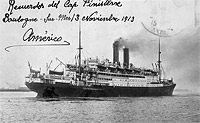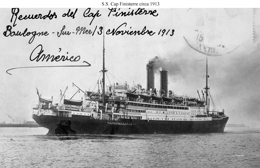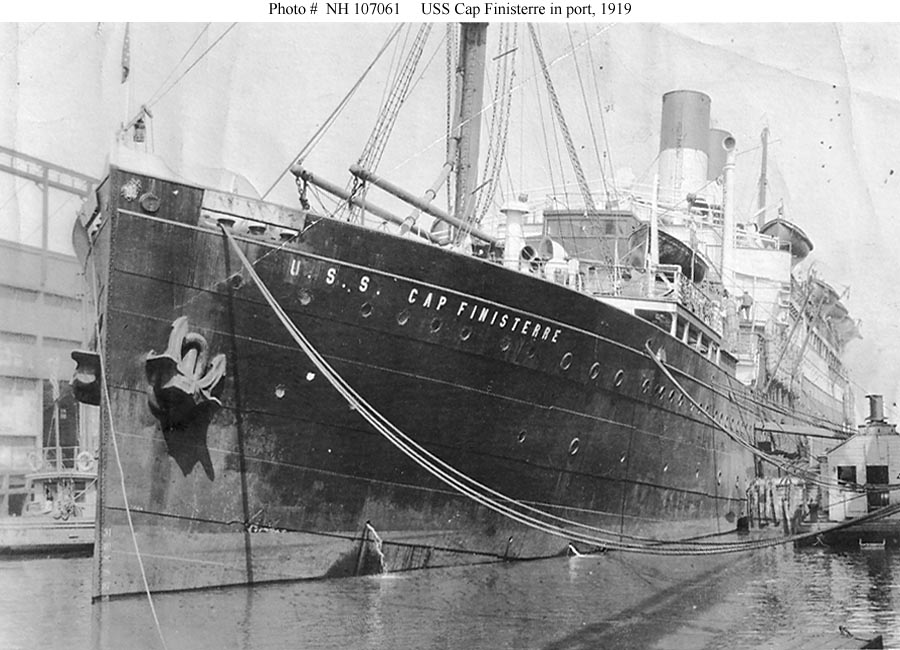 USS Cap Finisterre, a 14,503 gross ton troop transport, was built at Hamburg, Germany, in 1911 as the Hamburg Sud Amerika company passenger liner of the same name. She spent the First World War in Germany and was transferred to the United States under the terms of the Armistice agreement. Placed in commission by the U.S. Navy in April 1919 she made four voyages between Brest, France, and New York, carrying war veterans home to the United States and occupation troops to Europe. Cap Finisterre completed her final trip in mid-August 1919 and then spent several months at the New York Navy Yard. Decommissioned in late November 1919, she was turned over to the U.S. Shipping Board at that time.