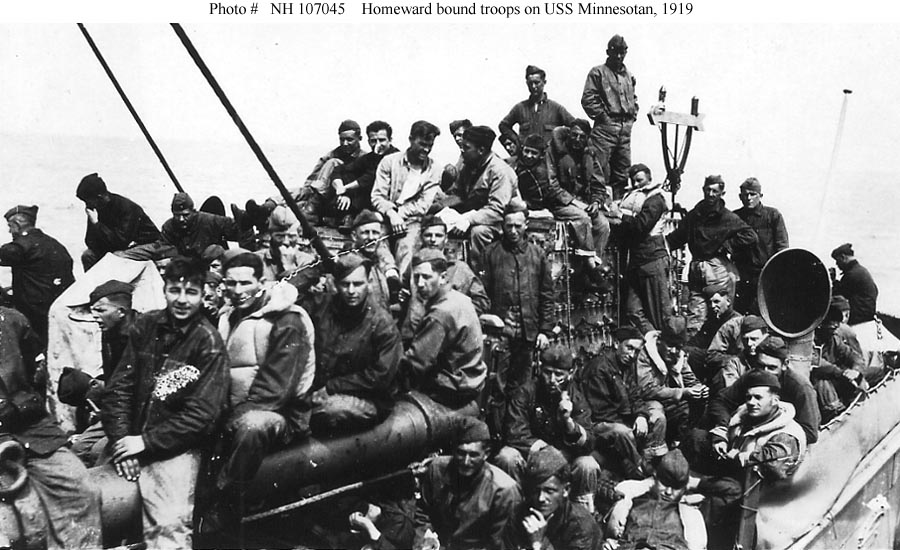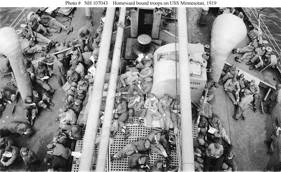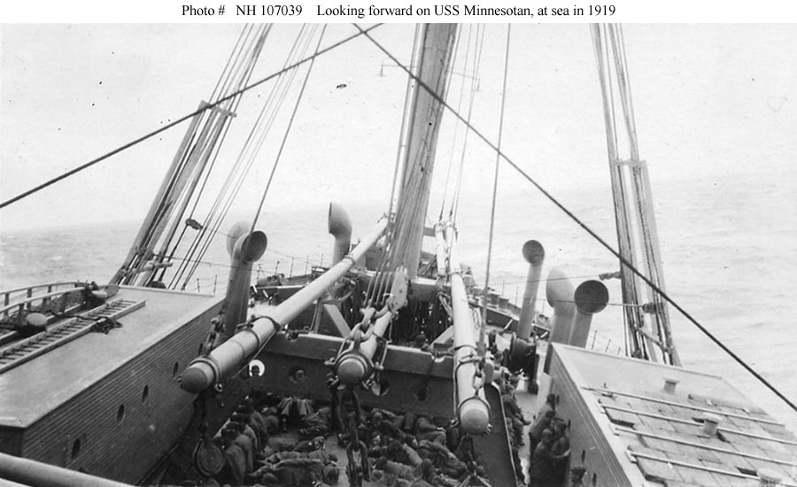 View looking forward from the bridge in 1919, while the ship was transporting American troops home from France.
