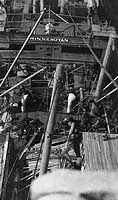 Note the lumber piled on deck, men working on and near the temporary deckhouses in the foreground, and the unfurled name banner on the face of the ship's bridge bulwark.