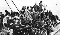 Homeward bound troops relaxing on deck near the forecastle break, while the ship was at sea in 1919. Photographed from the foremast.