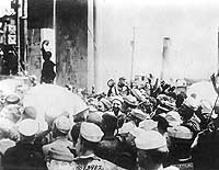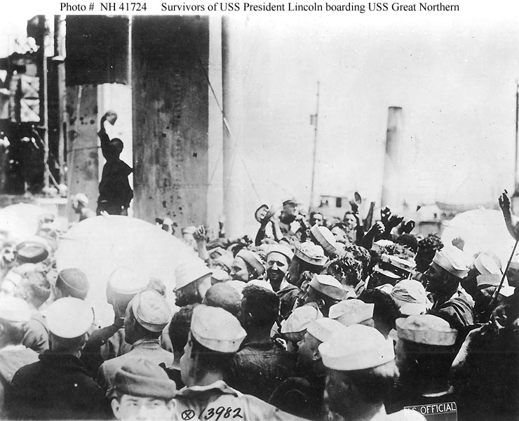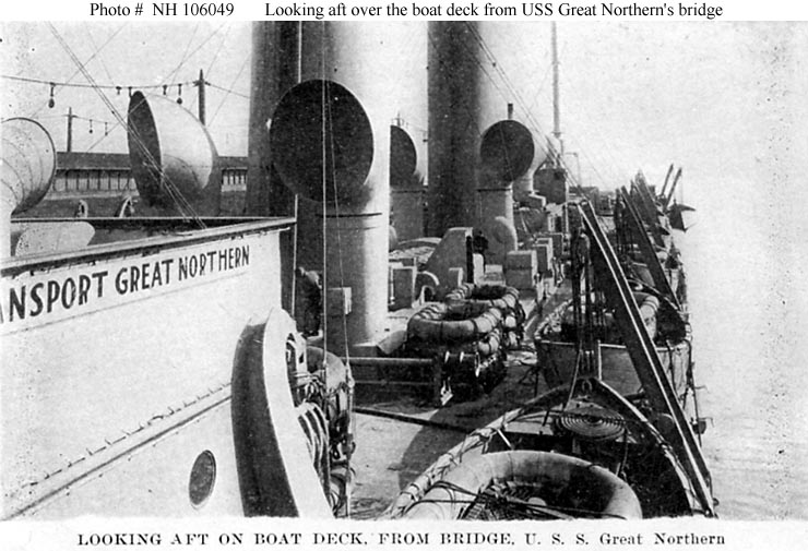 Homeward-bound troops posing on the ship's superstructure, 1919.