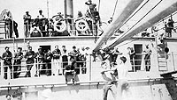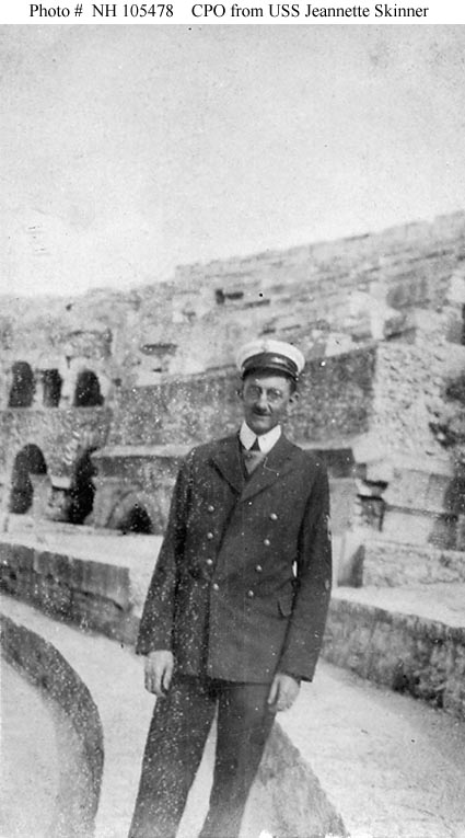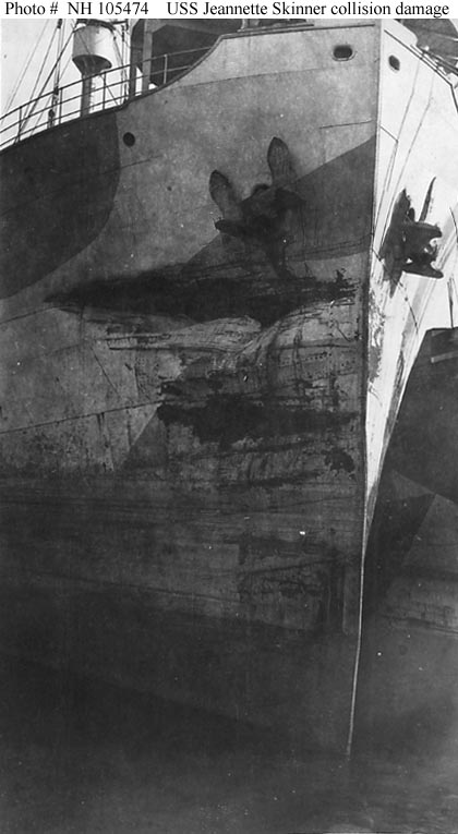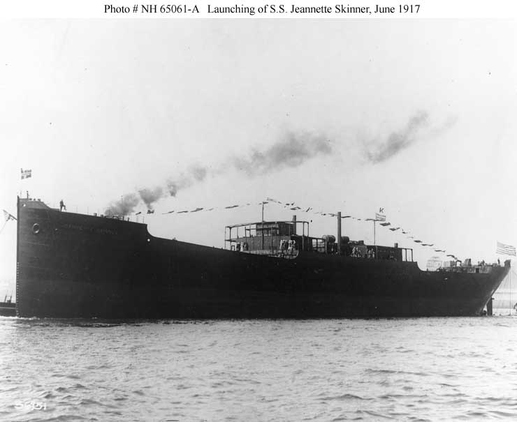 The freighter was commandeered by the U.S. Shipping Board in August 1917 and was commissioned in the Navy on 12 April 1918 as USS Jeannette Skinner (ID # 1321). After loading a cargo of general supplies at Baltimore, Maryland, she sailed from New York in May with a convoy for Brest, France. Returning to New York in June, Jeannette Skinner loaded another Army cargo at Baltimore and delivered it at Brest and Bordeaux, France, in August. Her third eastbound voyage took her from New York to La Pallice and Bordeaux in September and October. While in the Gironde River, France, on 27 November 1918, she was damaged in collision with the Japanese steamer Ceylon Maru. During her return voyage in December the ship had to put in to Bermuda for fuel and, upon arrival at Baltimore, entered drydock to begin two months of repairs. In March and April 1919 Jeannette Skinner carried a cargo of wheat, oats, and lard to Cette, France, via Gibraltar on behalf of the Southern Food Administration. Once again she had to refuel on her homeward voyage, this time in the Azores. USS Jeannette Skinner was decommissioned at Baltimore on 10 June 1919 and was returned to the Shipping Board.
