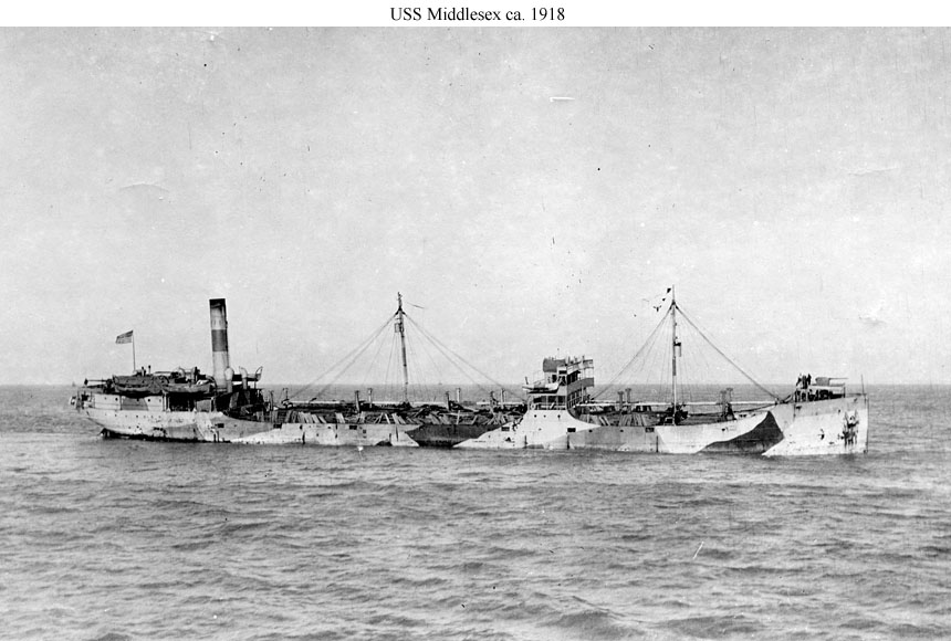 Middlesex, a 4727 gross ton collier, was built at Camden, New Jersey, in 1912. She was commissioned in the Navy at Norfolk, Virginia, in January 1918 as USS Middlesex (no ID # was assigned) and employed as a cargo ship. Taking on a shipment of general supplies and lumber, she sailed from Norfolk in late January as part of a convoy bound for Bordeaux, France. After operating along the French coast, she returned to New York at the end of April. Middlesex then loaded an Army cargo at Baltimore, Maryland, delivering it at Le Havre, France, in June. During the last part of 1918 she made two more such voyages, taking cargo to Bordeaux and Le Havre. USS Middlesex was decommissioned in January 1919 and delivered to the U.S. Shipping Board for simultaneous return to her owner, the Coastwise Transportation Company of Boston, Massachusetts. S.S. Middlesex was cut down to a barge in 1949 and scrapped at Philadelphia in 1952.