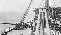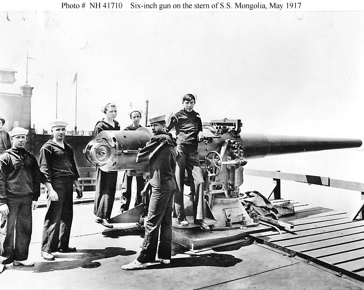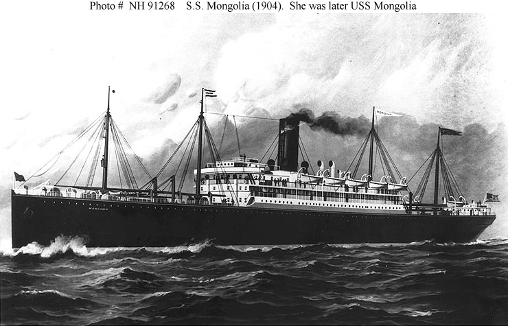 Mongolia, 13,638 gross ton passenger-cargo steamship, was built in 1904 at Camden, New Jersey, for trans-Pacific commercial service. In 1915 she was shifted to Atlantic routes and in March 1917 received a self-defense armament of Navy-manned guns. On 19 April she fought off a German submarine, the first such engagement after the United States entered World War I. Mongolia continued civilian operation for another year, mainly carrying U.S. troops to Europe. In April 1918 she was taken over by the Navy and, in early May, placed in commission as USS Mongolia (ID # 1615). She remained in transport service until the November 1918 Armistice, then began bringing American veterans home from the former war zone. With the completion of this task, USS Mongolia was decommissioned in September 1919 and returned to her owner.