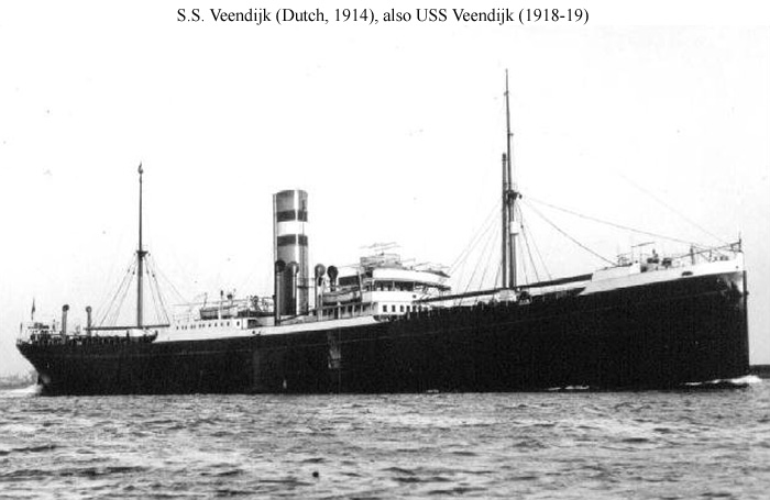 This page features all available views of the freighter Veendijk, which served as USS Veendijk (ID # 2515) in 1918-1919.