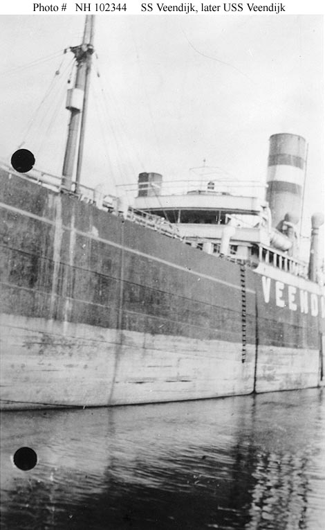 Veendijk, a 6874 gross ton freighter built in 1914 at Sunderland, England, was employed commercially by the Holland-America Steamship Line until March 1918, when she was seized by the United States Government. She was turned over to the Navy and, in early April, placed in commission as USS Veendijk (ID # 2515). As a unit of the Naval Overseas Transportation Service, she completed three round-trip voyages to France before the 11 November 1918 Armistice ended World War I fighting. During late 1918 and the first half of 1919 Veendijk made another trip to France and one to Uruguay. Decommissioned in August 1919, she was returned to her owner later in that month. The Holland-America Line continued to use her until 1933 when she was broken up.