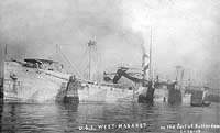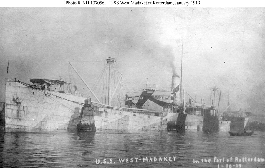 West Madaket, a 5808 gross ton (12,225-tons displacement) freighter, was built in 1918 at Seattle, Washington, as part of the First World War ship construction program. Transferred to the Navy when completed, she was placed in commission as USS West Madaket (ID # 3636) at the end of October 1918. The ship carried a cargo of flour from the West Coast to Rotterdam, Holland, between mid-November 1918 and January 1919, passing through the Panama Canal and stopping at New York and Falmouth, England, while en route. During February-April 1919 the ship made a second round-trip voyage to Europe, taking general cargo to France. USS West Madaket was decommissioned in May 1919 and returned to the U.S. Shipping Board.
