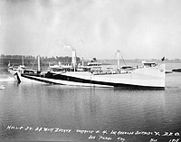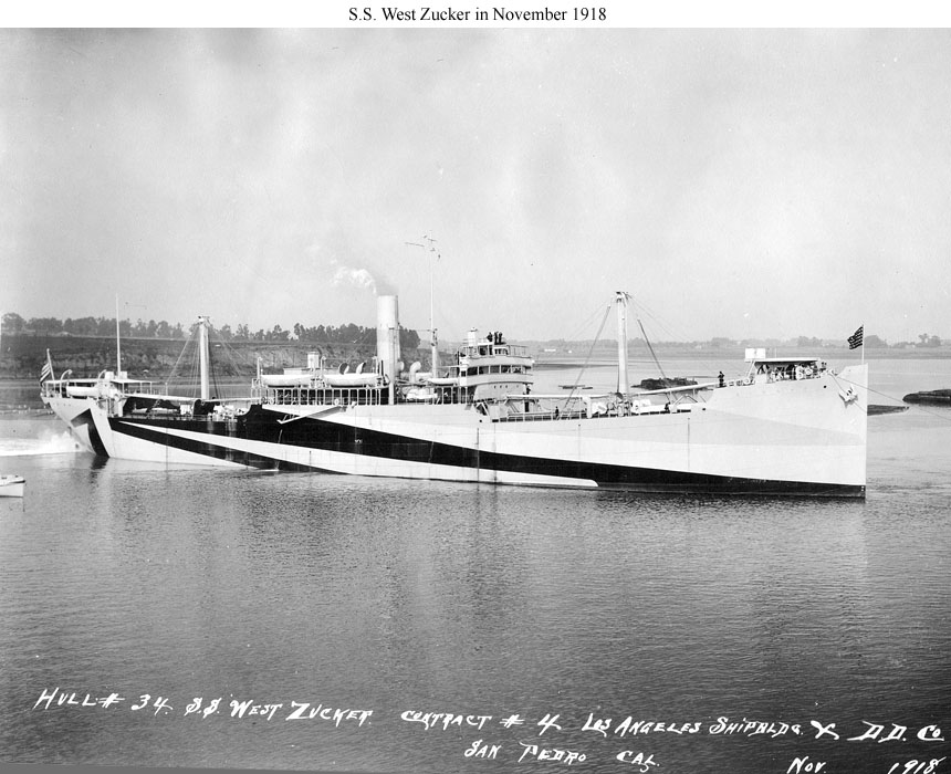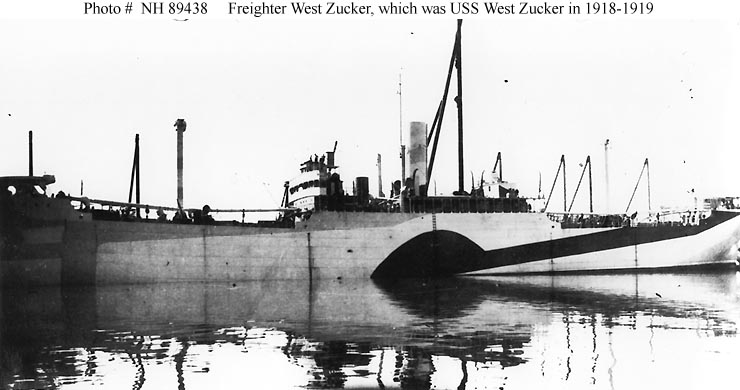 S.S. West Zucker, a 5808 gross ton (12,186.5 tons displacement) freighter built by the Los Angeles Shipbuilding and Drydock Company of Los Angeles, California, was completed in November 1918. She was turned over to the Navy at that time and placed in commission as USS West Zucker (ID # 3584). Early in January 1919 the ship left the West Coast with a cargo of flour, which she delivered at Hampton Roads, Virginia, in March. Decommissioned late in that month, West Zucker was returned to the U.S. Shipping Board, which retained her until 1933, when she was abandoned.