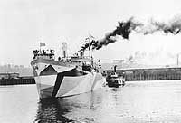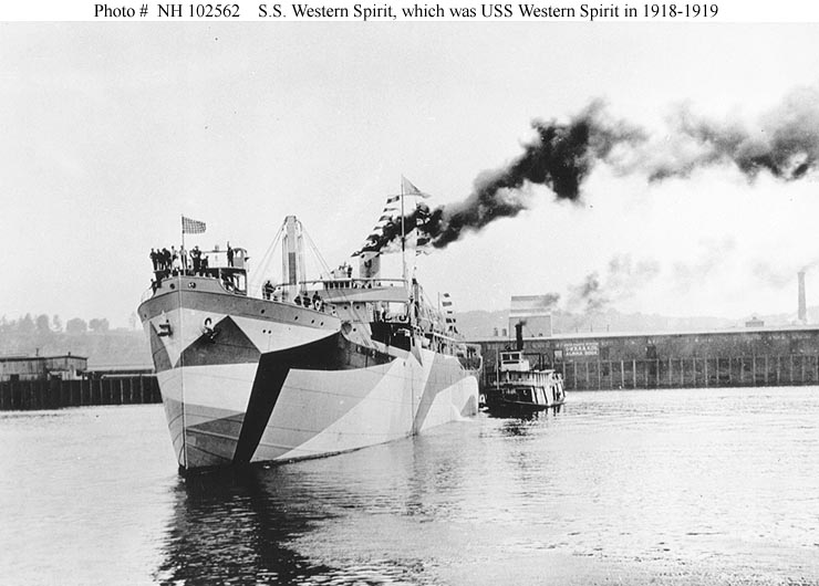 Western Spirit, a 5730 gross ton (12,185 tons displacement) freighter, was built at Portland, Oregon, for the U.S. Shipping Board. She was completed in July 1918 and turned over the the Navy, which placed her in commission as USS Western Spirit (ID # 3164) and assigned her to the Naval Overseas Transportation Service. The ship's maiden voyage was made to Chile, where she picked up a cargo of nitrates for transportation to the U.S. Gulf coast by way of the Panama Canal. In October 1918 Western Spirit began her only wartime trip to Europe. Delayed by engine problems, she arrived at a French port in November, after the Armistice had brought World War I combat to an end. Western Spirit returned to the U.S. in January 1919, and made another voyage to France in February-April. She was decommissioned later in April 1919. Returned to the Shipping Board at that time, she was abandoned by that agency in 1933.